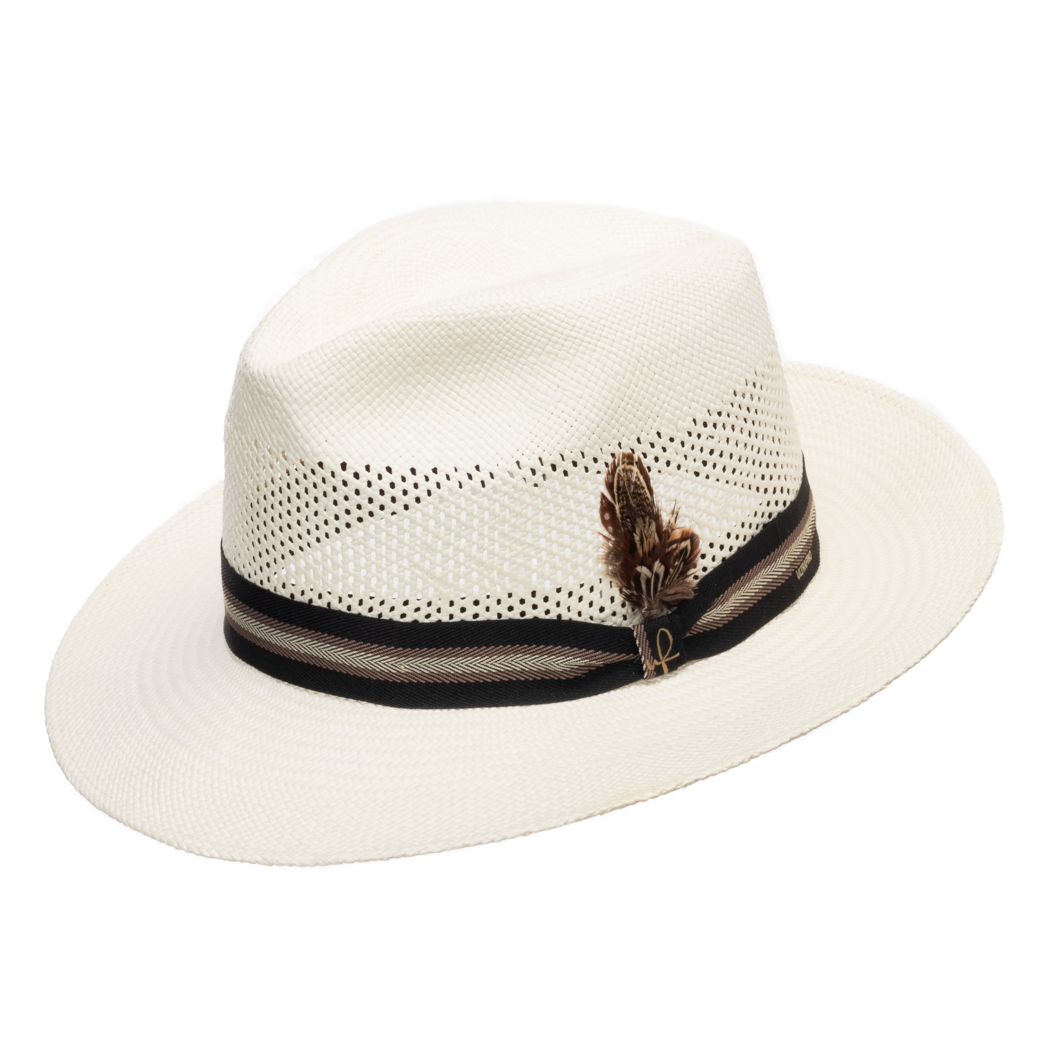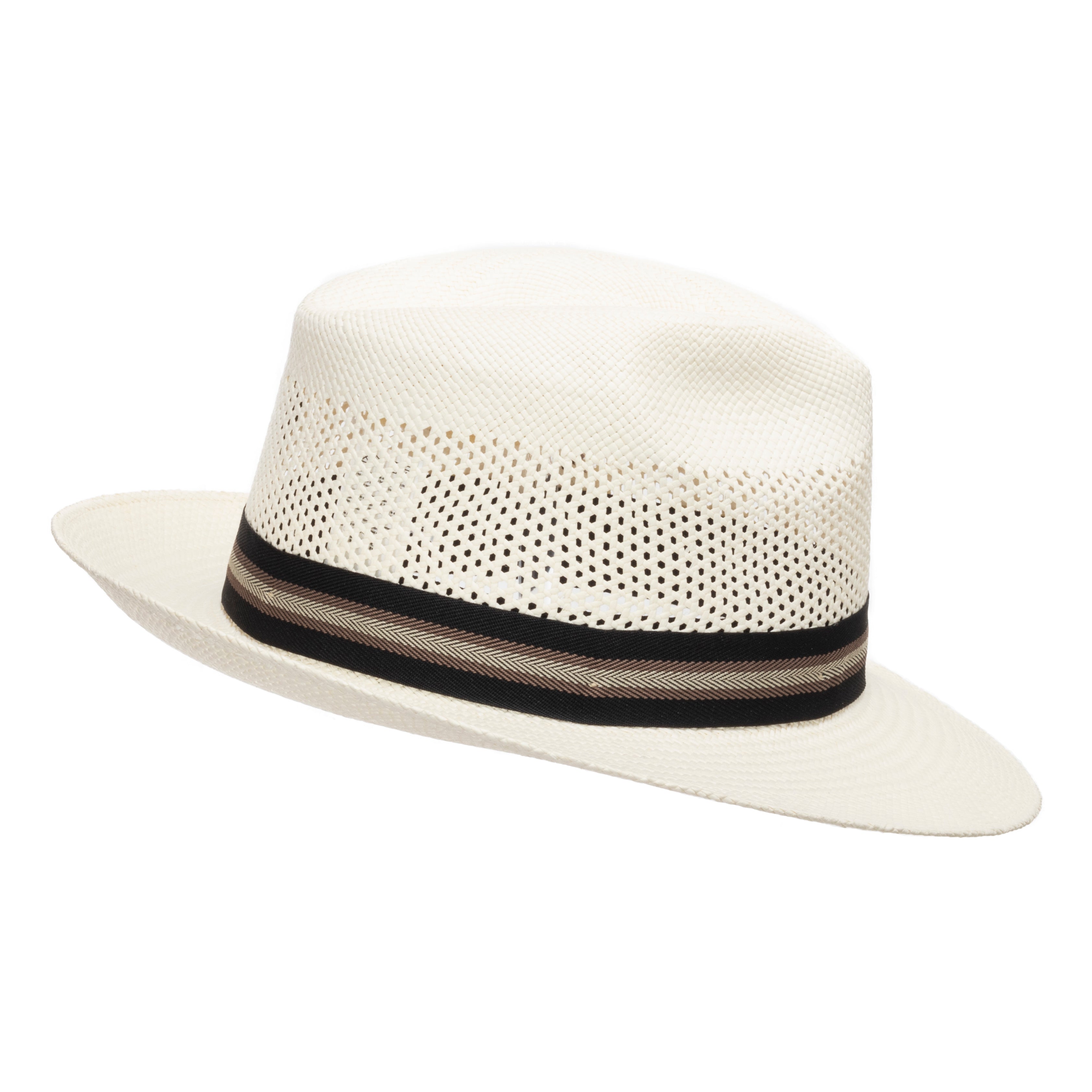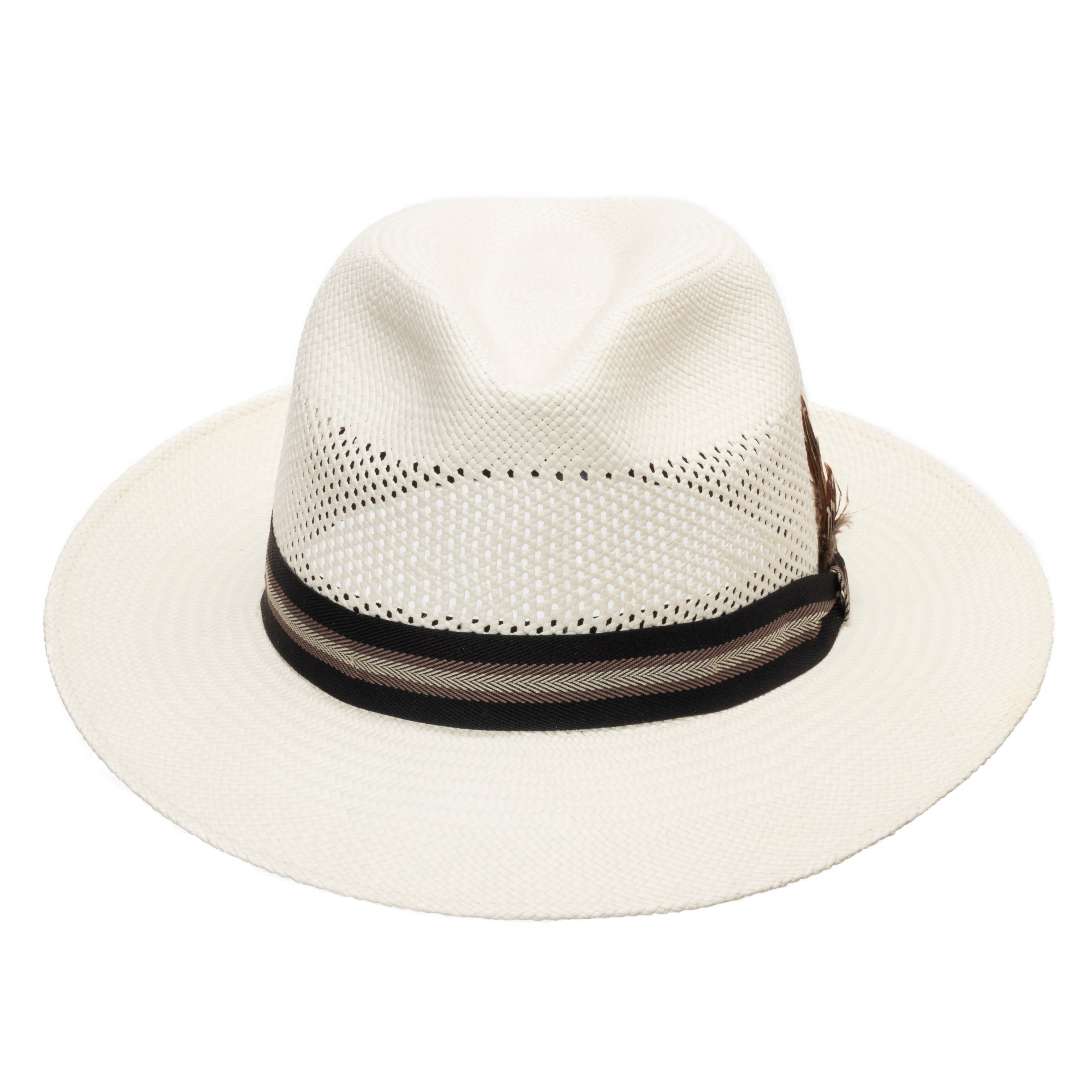 A fascinating and unique summer Panama hat. Made from toquilla straw in Ecuador and finished in the USA with a black sweatband and an elaborate chevron pattern grosgrain band. The crown features a vented weave pattern that allows your head to stay comfortably cool during the warm summer days.